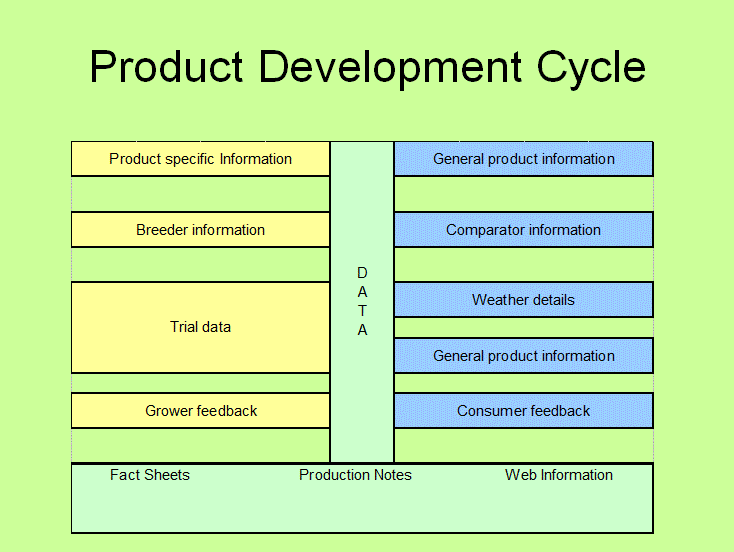 Plants are grown in extensive field and pot trial, data is collected and evaluated providing information for cultural and marketing information. The basic Product Development Cycle is represented in the adjacent diagram.